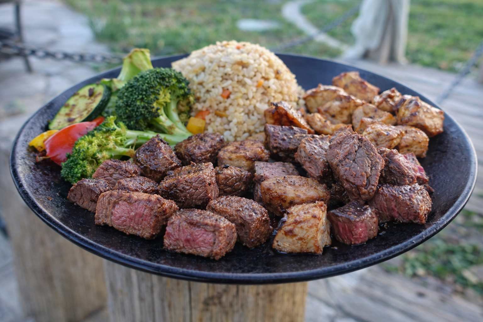 Menu Includes: Certified Kosher Steak, Chicken breast, Fried rice, Assorted Vegetables