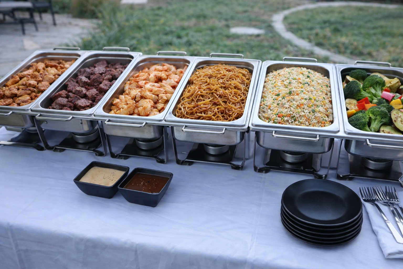 Includes: 4 oz steak, 4 oz chicken, Fried rice & vegetables, and full setup (tables, chairs, plates, forks)
